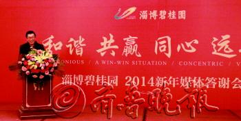 2014年1月20日,淄博碧桂园媒体新春答谢会在齐盛宾馆盛大举行,来自全市近30家新闻媒体的代表应邀出席。 在媒体答谢会上,淄博碧桂园负责人首先致辞,感谢淄博责任媒体敢于承担、乐于奉献、真实客观的职业精神,为淄博碧桂园的品质传播和品牌打造提供了有力的支持。与会媒体也纷纷表示,淄博碧桂园践行“碧桂园中国梦”这一品牌宣传,力在打造五星级生活品质,为淄博市民建老百姓买得起的好房子,这为淄博房地产市场带来了新鲜空气。 逐梦千里,大行德广。2013年,碧桂园集团取得中国地产销售额第六名、销售面积第二名的绝好成绩,用“千亿”的成绩来证明梦想是真实的。作为碧桂园集团征战齐鲁大地的第3个项目,2013年淄博碧桂园强势入淄,126天完美绽放,开盘3小时热销15亿,勇夺淄博楼市单日销售金额、单日销售面积、单日成交套数三冠王,创淄博楼市奇迹,再度续写碧桂园传奇。 2014年,淄博碧桂园将继往开来,用全新的开发模式和五星级的居住理念,给淄博人一个“五星级的家”,圆淄博人的居住梦想。 明星业主互动不断 各大奖项“名花有主” 淄博碧桂园岁末业主联谊会精彩落幕 明星大腕集体登台,一级资质物业齐展风采,各大奖项“名花有主”……2014年1月21日,淄博碧桂园岁末业主联谊会倾城上演,近2000名业主来到齐盛宾馆提前过大年。 一级物业展示风采 销售团队登台献艺 未来邻里提前见面 倾情共话“五星家园” 晚会一开始,精彩的水鼓舞轻松欢快、嘹亮的男高音响彻苍穹……一系列本土明星登台献艺,现场气氛逐步引入高潮。 随之而来的五星级物业展示更是让现场气氛高潮迭起。身着仪仗队礼服的碧桂园物业礼宾、身穿黑色西装的物业管家首次向业主们完美展示碧桂园物业的五星级服务,赢得业主们的阵阵掌声。 挺拔的身姿、精致的妆容、温馨的微笑、过硬的专业水准,国家一级资质物业的风采展示,让淄博人亲眼见证五星级家的“软实力”。 除了物业风采展示以外,淄博碧桂园的销售精英们也纷纷登台献艺。精彩的健美操表演《花样年华》,轻松欢快,展现了她们职场以外的青春靓丽和花样舞姿。 嘉宾业主同台互动 各大奖项名花有主 俗话说,远亲不如近邻。对于业主来说,联谊会还有一个更为重要的作用,提前认识新邻居。 “我们的房子都在一栋楼,有空来我家坐坐,我们也可以去泛会所打打麻将。”一位业主在联谊会上和未来邻居来了一次提前见面。她说:“平日大家都很忙,业主联谊会真的可以促进我们的邻里关系,让我们未来的生活更加融洽。” 新邻居们凑到一起,讨论的话题里肯定少不了淄博碧桂园。一位业主说:“选择淄博碧桂园,不仅是看中了它的五星级家园品质,还因为它是建淄博老百姓能买得起的好房子。不仅如此,今年淄博碧桂园3小时热销15亿,这给我们这些业主们增加了底气。” 该业主表示:“看着淄博碧桂园的房子一天天的盖起来,心里真的是说不出的高兴。” 除了精彩的节目表演以外,抽奖环节更是让业主们激动万分。除了人人有份的精致的福字春联以外,业主们更期待淄博碧桂园早已准备好的电冰箱、电烤箱以及床上三件套等重重大奖。 在抽奖环节,山东综艺频道《我是大明星》栏目的殷光栋、FM92.6的陈辰、FM106.7的老谈以及FM100的路捷等众多明星空降会场,让业主们惊讶不已,场上的气氛再度热烈。抽奖环节,获奖的业主们登上台来,不少业主还与嘉宾们玩起了互动。 一位获奖业主兴奋地说:“真的是太意想不到了,中大奖本来就很高兴了,更加高兴的是这里竟然还有我的偶像,实在是太棒了!” 经过数轮抽奖,各项大奖终于名花有主,联谊会现场异彩纷呈。