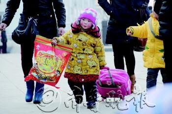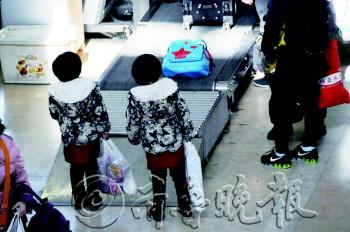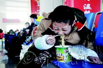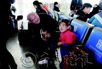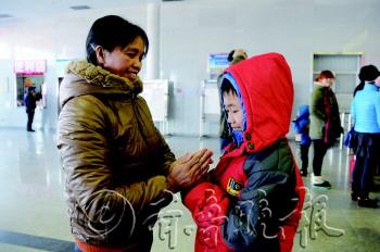 | ▲在火车站外,一位小朋友自己拉着行李进站,小脸被冻得红扑扑的。 |  | ▲火车站安检处,一对双胞胎姐妹在等自己的行李包。 |  | ▲候车室内,一位父亲细心地照顾自己的女儿。 |  | ▲要去和爸爸团聚的小伟在候车室吃泡面。 |  | ▲小杰的妈妈在售票厅帮他暖和小手,他们要回南方老家过年。 |