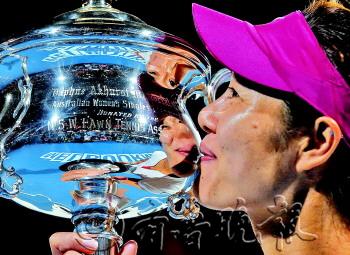 | 25日,在澳网女单决赛中李娜击败齐布尔科娃夺冠。图为李娜亲吻奖杯。