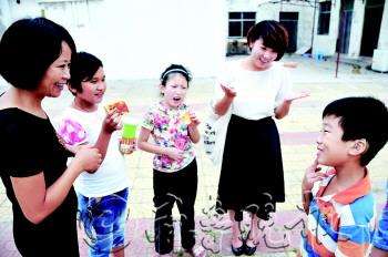 孔令茹(右二)在特教学校采访聋哑儿童。