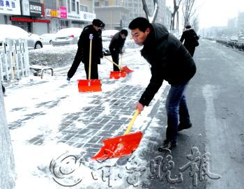 | 6日,在济南明湖东路上,历下区渣土办的多名工作人员临时集合起来,帮助保洁人员清除积雪。 本报记者 周青先 摄 |