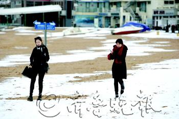 6日,在青岛第三海水浴场,两位女孩在雪中漫步。 本报记者 张晓鹏 摄
