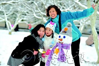 6日,一家三口在济南南郊宾馆雪地里堆完雪人后合影。 本报记者 陈文进 摄