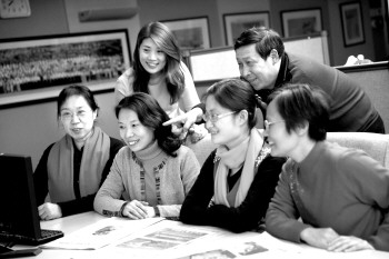 | 6日晚7时,姜美荣(前左一)、张昕(前左二)、林瑶(前右二)、刘昭菊(前右一)、刘款款(后左)、何磊(后右)六名读者编辑聚在电脑前看新春第一报版样模板。 |