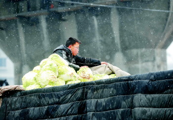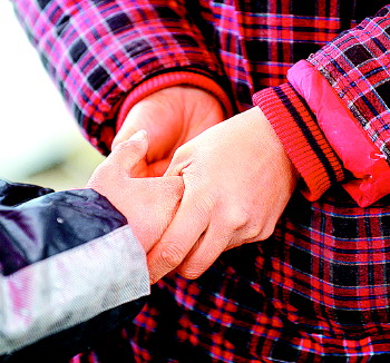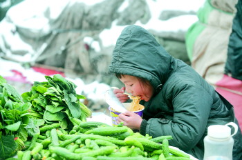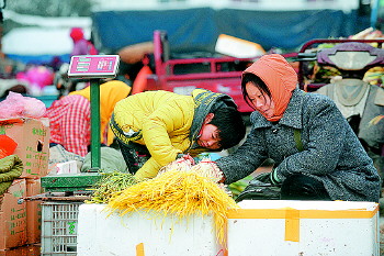 | 12岁的赵康文能帮父母干很多活。7日,他冒雪爬到车顶帮爸爸掀被卸白菜。 |  | 7日,小康文的手冻得通红,妈妈心疼地给他暖手。 |  | 7日,市场上孩子少,相邻的赵康文和杨存康成了好朋友,两人爬到货车上玩剪子包袱锤的游戏。 |  | 6日,玲玲帮妈妈整理蒜苗。 |  | 6日,10岁的王舒畅一边看摊一边吃午饭。 |