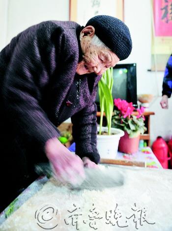 淄博市淄川区是蒲松龄的故乡,他教过书的西铺村南不远处就是岭子镇吕家河,102岁的吕杨氏就住在这里。 小村子位于山脚下的河边,是个长寿村。2月4日,大年初五,记者走进她家所在的小胡同。短短200多米,就遇到三位90岁以上的老人。吕杨氏见人便笑,耳朵有点背,但仍然忙着招呼记者:“请坐,喝水,吃了吗?” 79岁的儿媳妇张德兰在她身边照顾她,身兼数职:翻译、保姆、跑堂、玩伴。吕杨氏的孙子孙女们说,奶奶能活这么大年纪,最大的功臣就是张德兰,她照顾得好,老人家吃穿不愁,还天天有笑话听。 老人身份证上的名字就是夫姓加娘家姓氏。24岁进入丈夫家,后代有45人,直接带大的有13人。孙辈们说起奶奶,有一件事都很佩服:别看奶奶不识字,却给自己的婚姻做了主。1936年的一天,她居然一个人跑到济南,嫁给了大她近20岁的爷爷。 1943年,她回到吕家河这个大院子,三寸金莲踏遍附近的山梁沟壑。当年为生活所迫上山抬石头,一双小脚穿着绣花鞋,两三天就磨破一双。 老人至今依旧热爱劳动。孙子家3亩地的玉米,重达一吨半,她一个人5天就全部剥完皮,还能给邻居帮忙。而包饺子擀面条则更是老人的拿手好戏,年轻人都没她干得熟练。几个孙女干家务活都是她教的。老人没事就出门散步,活动半径近1公里,村里老人都爱和她拉家常。 吕杨氏96岁那年摔了一跤,导致髋骨骨折。在家人的精心照顾下,她居然神奇康复了,还能不扶拐自己走路。 老人说,吃零食,说笑话,这两样是她的长寿营养品。她爱吃虾皮、瓜子、饼干等,没有牙齿却和常人一样吃得津津有味,而说笑话能使她心情舒畅。 姓名:吕杨氏 性别:女 出生日期:1912年3月10日 籍贯:淄博市周村区王村镇 学历:不认字 生活习惯:早起早睡,爱劳动闲不住 后代:五世同堂,后代共45人 爱好:爱说笑话,爱吃零食,爱吃肉 百岁老人档案