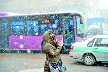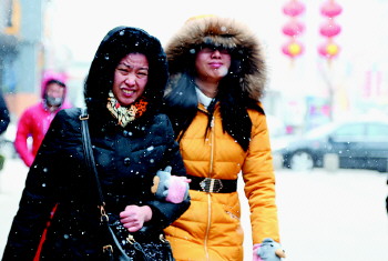| 受强冷空气影响,9日上午省城又飘起雪花。 本报记者 左庆 摄 |  | 9日,烟台下起小雪,行人走路时不得不眯着眼睛。