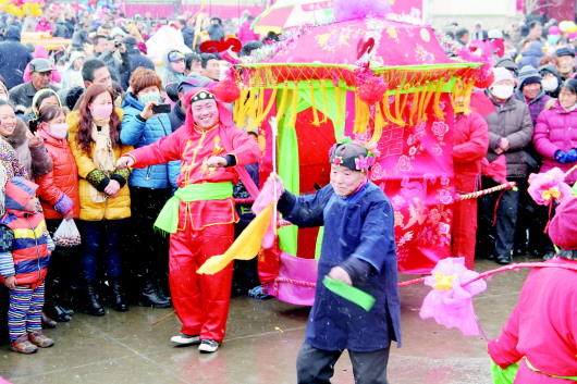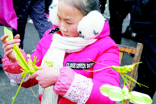7日上午9点多,抬花轿、撑旱船、挑花篮等民间传统节目掀起了庙会的高潮。前来赶庙会的人群跟随着这些传统民间节目一直走到兴国寺门前。孩子们都爬到了车上,年龄较小的则直接骑在了父母的肩膀上,年龄大的老人们更是看得直乐呵。“好久都没看到过这个了,我以前也跳过这个。”前来赶庙会的耿女士高兴地说。 周彬祥是节目团的团长,今年65岁,是博兴县吕艺镇龙河村的村民。“现在生活条件好了,没事儿就在家里自己瞎捣鼓。”周彬祥说,他所带领的团队已有5年多,都是村里喜爱民间传统节目表演的老人们组成的,平均年龄60岁,衣服、道具等也都是他们自己花钱买的,在村里没事儿的时候大家就会聚集到一起进行排练,“今天是因为天气不好,舞狮子啥的我们也没带来,我们在家不仅排练这个,还有京东大鼓、京胡等很多节目呢。” 牟喜荣是节目团里年龄最大的,今年70岁,在这里面扮演的是“媒婆”,牟喜荣表演起来有模有样,表情、动作很到位。“我在家没事儿的时候就自己对着镜子练习,也跟着大家一块练,老了图个乐呵。”牟喜荣笑着说。 “这个五块,这个六块,这个八块。”13岁的牟云寒一边说一边指给询问价格的买主说。牟云寒是潍坊市青州人,早上4点多便从家里出发赶到丈八佛庙会做生意,她爸妈则在离她不远的地方卖烤肉,她和6岁的弟弟牟云飞负责卖用塑料编制的各种小玩意。 庙会上,小小年纪的她和弟弟守摊位、卖东西引来了不少人群,“这些东西都是我和妈妈昨天晚上编出来的,我从去年开始跟着妈妈学着编这些东西。”牟云寒一边编手中的“凤凰”,一边告诉记者,她和她妈妈编的主要有“凤凰”、“蝴蝶”“蜻蜓”等,她一边熟练地编制,一边照顾生意,还要照看她6岁总是到处乱跑的弟弟。 “这个八块的便宜点儿行吧?”一个想买“凤凰”的人问,牟云寒一边编一边回答说:“不行,少一分都不卖。”干脆利落的回答引得周围人都笑了,这时又有人提醒她弟弟不见了,牟云寒便马上到处张望寻找弟弟,原来,弟弟偷偷地跑到了他们家车上去了。 为了照顾她的生意,不少年龄较大的也前来买牟云寒编的小玩意,其中有人给她一张一百元,她小小年纪竟然懂得把钱放在耳朵上听一听,然后再拿着朝上看一看,足足的小老板架势得到了人们的赞赏。“我可能就待两天,我爸妈在这里的时间要长一些。”牟云寒说。