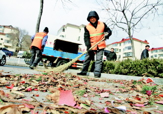 9日上午,在高区古寨路段,环卫工人正在清扫鞭炮屑。年后,许多商铺纷纷燃放“开门炮”。高区环卫处工作人员介绍,今年春节期间,每名环卫工人每天要清理1吨鞭炮屑,重量相当于去年的一半。