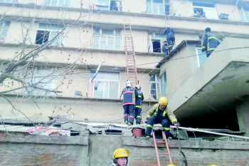 9日下午3点多,芝罘区环海路23号附33号居民楼着火,13位居民被困屋内。由于周围杂物多、道路窄,救生气垫和云梯车都施展不开,消防人员临时用拉梯为居民们搭建生命通道,最终将13位居民安全救出。 现场>> 着火的是栋筒子楼 现场一片狼藉 楼里楼外的地上全是灭火后结成的冰疙瘩,3楼楼梯口放着一个被烧毁的旧床,走廊昏暗狭长,原本宽2米的通道两边堆满柜子和杂物,只余下1人通行的空间……10日上午,记者来到环海路幸福六村这栋居民楼的时候,眼前展现的就是这样的场景。 据介绍,着火的居民楼是一栋上世纪90年代的筒子楼,整栋楼共有30几户居民,大多都是租房户。4楼通往楼顶的楼道有成堆被烧焦的木头和煤炭。76岁的衣老人正在将楼道里的残渣一桶一桶往外拎。提起9日下午的火灾,4楼的几位居民都心有余悸。 讲述>> 65岁老太太 被困楼梯上 65岁的丙女士住在4楼的68号,她告诉记者,9日下午3点多,13岁的孙女发现着火后,打开门就跑了出去,担心孙女被呛到,本来想在屋内等待救援的老太太也顾不上那么多,拿了块没来得及沾水的干毛巾,捂住口鼻就往楼下跑。“跑到4楼下3楼的楼梯就被困住了,下面也是火上面也是火,我就大喊救命,幸亏我儿子回来了,跑上来把我扶下去了。”丙女士说,她是属于逃生较早的居民,另外还有1-3楼的居民大都也跑了下来,大家全身都落了一层黑灰。 居民误开门,被浓烟逼到窗台 住在4楼73号的黄女士就没有那么幸运了。9日是周末,黄女士19岁的女儿和外甥都在家里,吃完饭就开始玩电脑,听到门外有动静时浓烟已经充满了整个楼道。“我姑娘打开门想看看怎么了,烟一下子就冲过来,一下把她给呛晕在地上了。”黄女士说,看到女儿晕倒,她顿时慌了,立刻把女儿拉到房间的床上。“当时烟就已经进来了,我也顾不上关门,先把窗户打开了。”这一来,房间里立刻形成了对流,滚滚浓烟源源不断地通过黄女士房间冲向窗户,屋里立刻就什么都看不见了。 唯一能看到光的地方就是窗户,3个人摸黑爬到窗户边。黄女士说,她最担心的是走廊上的煤气罐爆炸。“大家都在走廊上做饭,每户的柜子里都有1到2个煤气罐,万一爆炸了就完了。我让他们俩站到窗台上。害怕啊,两人直想跳楼,这可是4楼,我拉住他们,楼下的人也大喊‘别跳’。”消防人员很快发现了他们,用拉梯将3人安全疏散到楼下。 救援>> 火势较大,10辆消防车来灭火 据海港路消防中队指导员董虎介绍,在9日下午3点多接到报警后,中队便出动了2辆水罐消防车和14名消防人员赶赴现场。当时居民楼4楼窗户往外冒烟,被困居民趴在窗户上等待救援,还有的居民抱着宠物站在窗台上。消防人员分成两队,一队救人,一队灭火。4名消防人员佩戴呼吸器进入火场寻找着火点,另外有2名消防员用梯子从北面上2楼平台,出水对着火点进行灭火。救人的消防人员4人在南面救援,其他在北面救援。 由于居民楼所处的位置附近都是杂物,没有空旷的场地,无法铺开救生气垫,云梯车也施展不开,只能依靠拉梯来搭建救生通道。共有4个消防中队,10辆消防车,41名消防员参与救援和灭火。下午5点,大火被全部扑灭,共有13位居民被成功营救。 目前,具体的着火原因,还在进一步调查中。 私搭乱建多 老楼隐患不少 据悉,此次火灾并不大,但却有不少居民被困。指挥救火的海港路消防中队指导员董虎说,居民在火灾发生后,慌张中将门打开,致使家中进烟。另外,一些居民在逃生中没有匍匐弯腰,甚至连湿毛巾都没准备,这也容易在逃生时被浓烟呛到。 此外,居民生活中的防火意识也不高,大多居民都在走廊上做饭,私搭乱建情况很严重,“3楼居民用铝合板建了厨房,几乎每户居民都在走廊放了柜子,里面有液化气罐。那栋楼是砖混结构的老楼,这些东西都是易燃易爆品,会助长火势。”现场参与救人的刘国强说。 像这种格局的老楼,在烟台还有不少,都或多或少存在类似消防隐患。消防人员提醒,居民楼道是火灾发生时的生命通道,必须保持安全畅通,不要把楼道当做仓库,随意堆放可燃物和其他杂物,居民要自查身边的安全隐患,有以上问题要及时整改,以免发生意外。 奖励线索人张先生50元