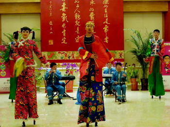 2月7日,在泰安市刘老根大舞台,二人转演员正在进行踩高跷等文艺表演,当天的演出现场座无虚席。 本报记者 刘振 摄