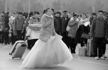| 一位穿好礼服待考的艺考生被冻得缩着脖子。 本报记者 姜文洁 摄 |