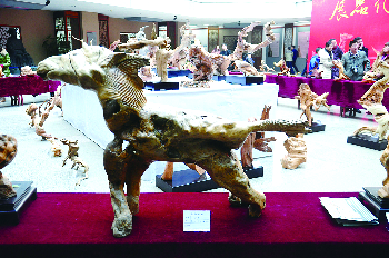 展出的根艺作品件件别开生面、匠心独运,表现了大自然的巧夺天工,彰显了根艺的无穷魅力。其中,一件叫“追梦”的马形根雕受到市民的青睐。 本报记者 张永斌 摄影报道