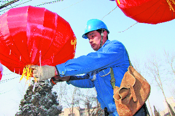 | 电工师傅对沿路悬挂灯笼接线情况进行检查。 |