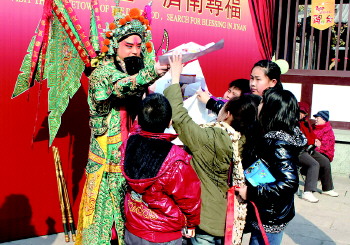 大年三十,济南客运段高速动车队第三包乘组乘务员向乘客送“福”拜年,一名小乘客将自己的绘画作品赠给乘务人员并说:“姐姐,辛苦了”! 2014年春运,是中国铁路总公司组建之后的第一个春运,又正值党的群众路线教育实践活动深入开展的关键时段,这是全国铁路系统开展“安全出行、方便出行、温馨出行”活动的一个缩影。 秦琼祠请门神 □于馨宁(小学生)