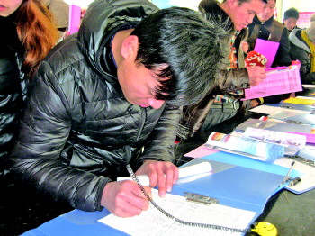 | 应聘者在填表,不少应聘者对单位待遇、工作保障有了更高的要求。 |