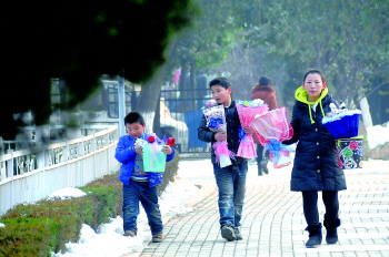 2月13日,距情人节还有一天时间,情人节气氛已“扑面而至”,大街上玫瑰、巧克力等情人节礼物热销。不少家长希望锻炼孩子,让孩子参与到情人节卖玫瑰的大军中,向路过情侣推销情人节礼物。