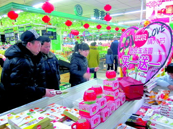 | 超市打出情人节招牌的元宵卖得俏。 本报记者 赵念东 摄 |