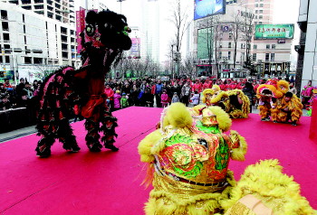 13日,在香港中路与南京路路口,青岛祥鸿狮会的雄狮正迎着锣鼓的节奏尽情舞蹈。为迎接元宵节的到来,一场狮王争霸赛上演。当日共有来自岛城的八支舞狮队一展技艺、争夺狮王。