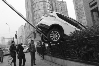 本报2月13日讯(记者 曹思扬) 13日7时许,在位于福州南路85号的山东国际旅行卫生保健中心地上停车场内,一辆福特越野车在倒入停车位时,新手司机误将油门当刹车,撞倒后面旗杆后,“骑”在了护栏上,万幸无人受伤。 8时许,记者闻讯后赶到福州南路85号,看到在山东国际旅行卫生保健中心院内的地上停车场中,一辆白色的福特翼虎越野车车头着地,车身越过了停车位与护栏间的绿化带,车尾搭在了约1米高的护栏上,一根歪斜的旗杆压在车底下。由于这俩越野车的“造型”实在奇特,路过的市民纷纷拿出手机拍照。 停车场保安称,早上7点多,这辆车的司机把车开进院内准备倒车进停车位,谁知车突然向后冲向旗杆和护栏,司机下车后看上去吓得不轻。保安暂时空出了附近的车位,方便拖车进来救援。 司机是一位中年男子,正在现场联系拖车和吊车。司机介绍,他是一名新手,春节前才提的新车,倒入停车位时错把油门当成刹车,车一下向后冲去,所幸没有受伤。 (奖励线索提供人潘先生30元)