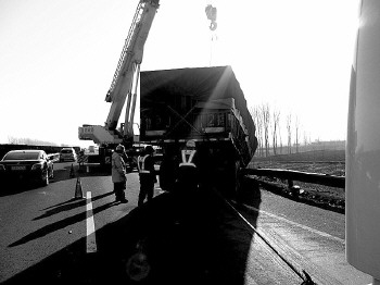 | 路政人员将冲出护栏的大货车救出。