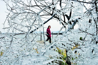 持续数日的低温天气,导致海港公园近海的岸边出现了冰雕奇观,除了冰雕玉砌的栏杆,近海绿化带内的植物也被冻成了罕见的冰挂。