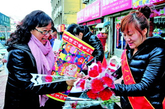 13日,在西北村社区,工作人员为社区计生家庭送上了鲜花、挂历等物品,还组织社区居民进行健康查体活动。今年的元宵节和情人节为同一天,社区工作人员通过活动希望居民度过一个愉悦的节日。