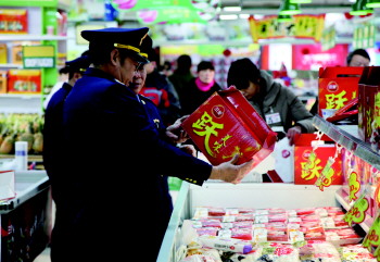 近日,淄川区工商局在辖区内开展商品包装物虚假宣传专项检查活动,以大型超市、商场等场所为重点,主要查看部分商品包装是否进行虚假夸大宣传。图为该局执法人员在某超市内进行现场检查。