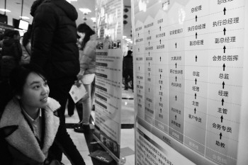 | 在招聘会现场,不少公司打出了“晋升机制”来吸引人才。 本报记者 王鸿哲 摄 |  | 在招聘会现场,毕业生积极寻找适合自己的工作岗位。