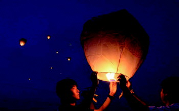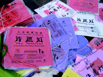 | 市民在放飞孔明灯(资料片)。 |  | 市面上售卖的各式孔明灯。 |