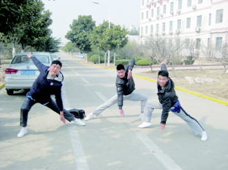 正月里,艺考生们奔赴各地赶考,有时一天要赶三场考试。正月十五这天,考生李振和几位同学选择到下一站考点准备。虽然考点离家很近,但他们都不会回家过节。图为考生展示健美操动作。 本报记者 杨霄 摄影报道