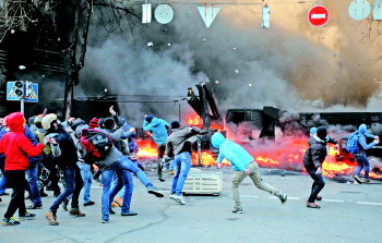 2月18日,在乌克兰首都基辅,示威者与防暴警察在议会大楼附近发生冲突。截至本报截稿时,乌卫生部公布的最新数字显示,这起冲突已造成26人死亡。这场大规模骚乱是受俄罗斯支持的政府和欧盟支持的反对派之间矛盾激化而导致的,反映了背后大国势力之间的角力。