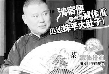 | 郭德纲代言的“藏秘排油”减肥茶被央视2007年“3·15”晚会曝光为广告夸大宣传,郭德纲因代言该产品被北京一市民告上法庭。