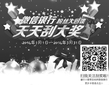 形式新颖 回馈丰厚 据了解,在此次活动期间,用户只需关注“建行电子银行”公众号,即可享有刮奖资格。用户只需发送“刮奖”或点击微信菜单(悦生活-今日视点)访问活动页面,屏幕上就会出现一张“刮刮卡”,用户可直接在屏幕上刮奖。每个客户每天享有6次刮奖资格,并可在全天任意时间刮奖。除了新颖的参与方式,此次活动还提供了包括三星智能手机和手机话费等丰厚的奖品作为年终回馈。 此外,在此次活动期间,用户关注“建行电子银行”公众号后,如绑定账户并办理1笔缴费、信用卡还款等交易,还可获赠10元手机话费,话费数量有限,先到先得。 提升关注 促进体验 建行在去年11月升级了微信公众平台,兼具金融服务和在线客服功能,充分满足用户在碎片化时间办理金融业务的需求,并基于微信的社交应用,实现了一对一客户服务功能。升级后的建行微信平台转变为集微金融、悦生活、信用卡三大业务为一体的综合性服务平台。 据了解,此次粉丝回馈活动旨在促进建行微信公众号关注度增长,使更多用户有机会了解和体验建行微信银行提供的账户查询、购买理财产品、信用卡等金融服务和缴费充值、购买机票影票等生活服务。 科技先行 以人为本 从之前的网上银行、手机银行,到不久前升级的微信银行都不难看出,建行始终将客户体验放在首位,将先进科技与人文关怀贯穿在产品研发和服务推广过程中。 深谙移动金融发展脉络的建行,将丰富的民生业务融入到微信银行当中,为用户提供了诸多便利和福利,使用户在被创新科技吸引的同时,还能体验到浓浓的人文关怀。马年新春的温情回馈,让我们拭目以待。