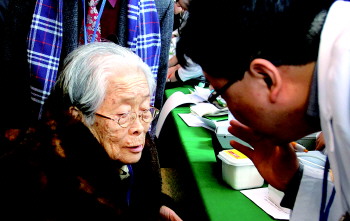 | 2月19日,医生在了解96岁高龄的金成润(音)的身体状况。她是此次团聚活动中年纪最大的。 新华社发 |