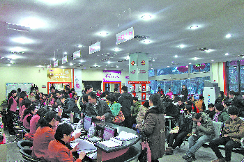 | 在阳光大姐公司,等待预约家政工的市民坐满了大厅。 |