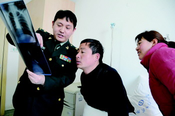 | 关节外科主任潘风雨正在检查蒋兴保的恢复情况。 本报记者 李泊静 摄 |