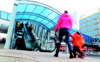 19日,记者在南大街购物中心路段发现,过街天桥的电梯已成功投入使用,行人过马路时可以通过电梯上下天桥,省下不少力气。