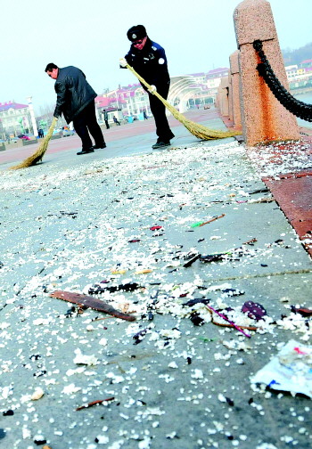 19日,滨海广场的工作人员正在广场清扫地面。据广场工作人员介绍,前几天的大风巨浪持续拍打,大风过后满地的海带、养殖泡沫、沙石,18日清扫一天后,19日一大早又打上来很多,广场管理处的工作人员已经将杂物清理干净。