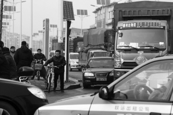 19日,在胜利街与青年路交叉口,一辆中型货车与一辆黑色轿车在右转时发生碰撞,两车挤在一起,并未发生伤亡,却给交通带来了不便,在此经过的车辆拥堵在了一起。 本报记者 王小会 摄
