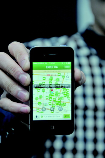 本报记者 王鸿哲 摄 |  | 一出租车司机向记者展示他使用打车软件的接单。 本报记者 王鸿哲 摄 |