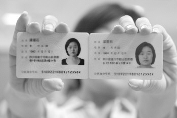 | 2013年9月11日,长沙,王女士把自己的身份证和捡到的“山寨身份证”(左)进行对比,个人信息几乎完全一致,难以区分。 (资料片) 东方IC供图
