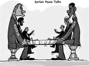 图上方英文意为“叙利亚和谈”,叙利亚政府与反对派的代表举行谈判,而叙政府背后的支持者是伊朗和“俄罗斯”,叙反对派的支持者是海湾阿拉伯国家和“美国”。