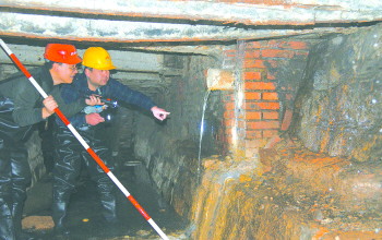 | 工作人员进入南门桥涵洞内,依次排查出现的排污口,在朝山街附近发现了一家酒店的排污管道。 本报记者 王光营 摄 |