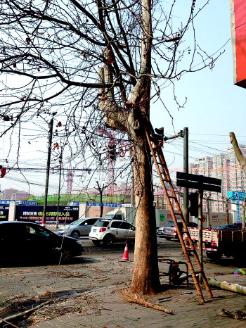 本报96706热线消息(见习记者 戚云雷 实习生 陈姿彦 韩长燕) 21日上午9点半,在槐荫区经七纬十二路口处,一名正在修剪树木的工人从6米高的树干上坠下,造成膝盖粉碎性骨折,额头也被磕破。 记者赶到现场时,受伤的工人已经被送往市立五院。回忆起事发时的情景,伤者老杨的同事李女士说:“当时我们正在地上各干各的活儿,老杨在树上用电锯修剪树干,突然听到‘咚’的一声,我们一回头,就看见满脸是血的老杨在地上蜷成了一团,不停地抽搐着,嘴中还喊着‘我的腿,我的腿’。” 意识到老杨的腿可能摔断了,工友们赶紧拨打了120急救电话。由于老杨正好掉在了路边有积水的地方,工友们小心翼翼地将老杨挪到了一处工地等待救援。救护车稍后赶到,将老杨送医。 “才刚爬上去一会儿,就摔下来了。”据介绍,伤者姓杨,43岁,原在德州禹城打零工,专门给人伐木,前不久跟包工头来济,当天是第一次出工。 “可能是锯下来的树枝倒在了电车的架空线上,架空线又把树枝弹到了老杨身上,把他弹落到地上。”老杨的一位工友推测。记者看到,除了地面上散落的几根被锯下的树枝,还有一根较大的树枝横在树杈上,树枝距离电车的架空线不足10厘米。 据医院方面介绍,老杨的膝盖粉碎性骨折,过几天需动手术,伤情较严重。