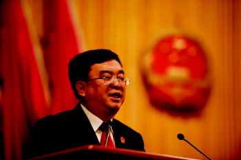 | 青岛市中级人民法院院长祝华在作报告。本报记者 张晓鹏 摄 |
