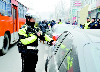 | 24日,交警在济南市历山东路对不规范停放的机动车进行处罚。 本报记者 崔岩 摄 |