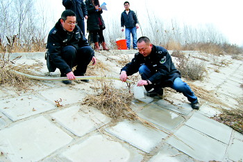 | ◥24日,历城区环保局执法人员对赵王河的水进行了取样调查。 |