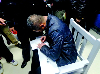| 司机刘明(化名)在讯问笔录上签字。 本报记者 王兴飞 摄 |