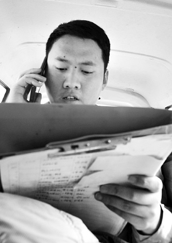 | 在车上,师傅通过密密麻麻的通讯地址确定路线。 |